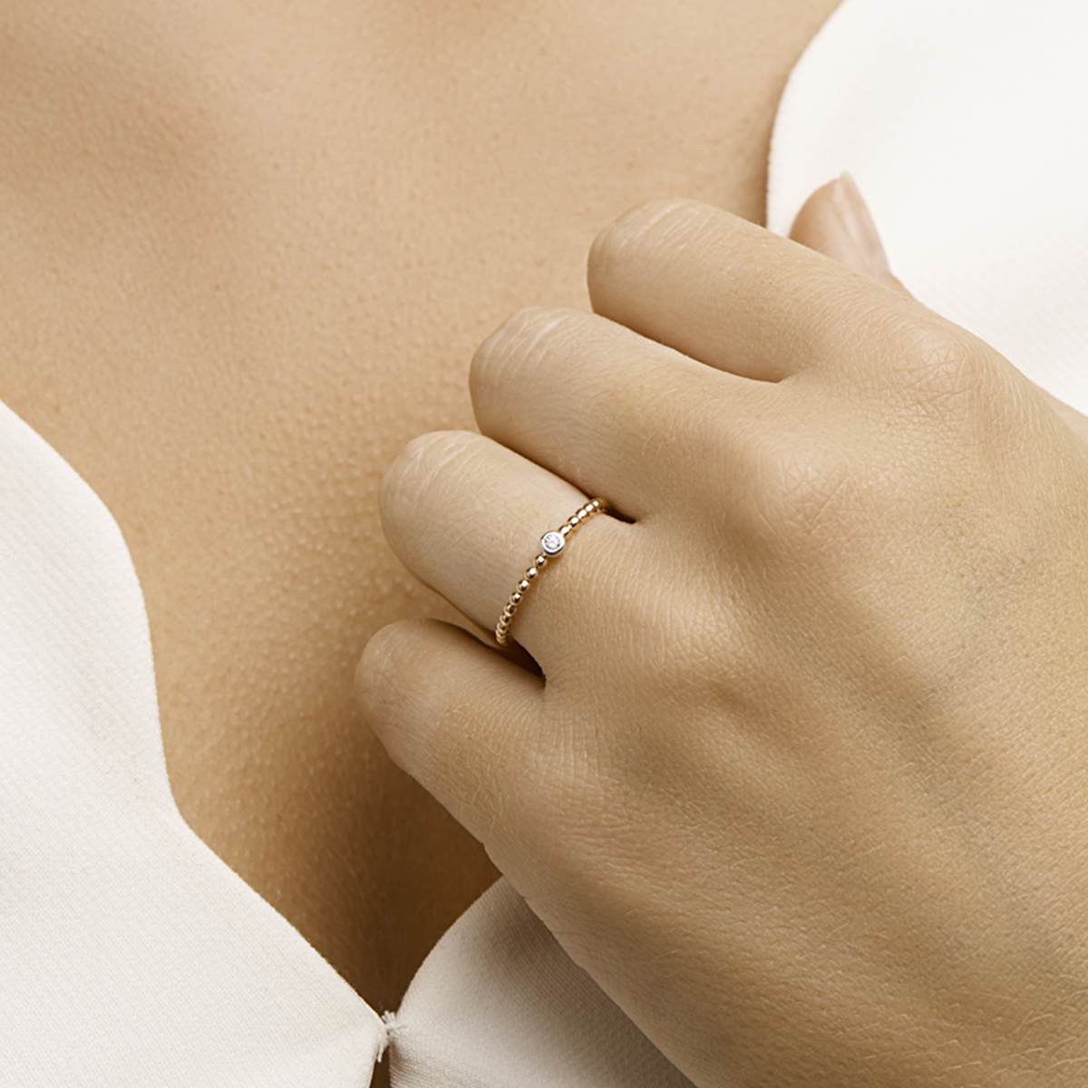 14k Rosegouden ring uitgevoerd met een heldere zirkonia. De ring heeft een breedte van 3mm.
