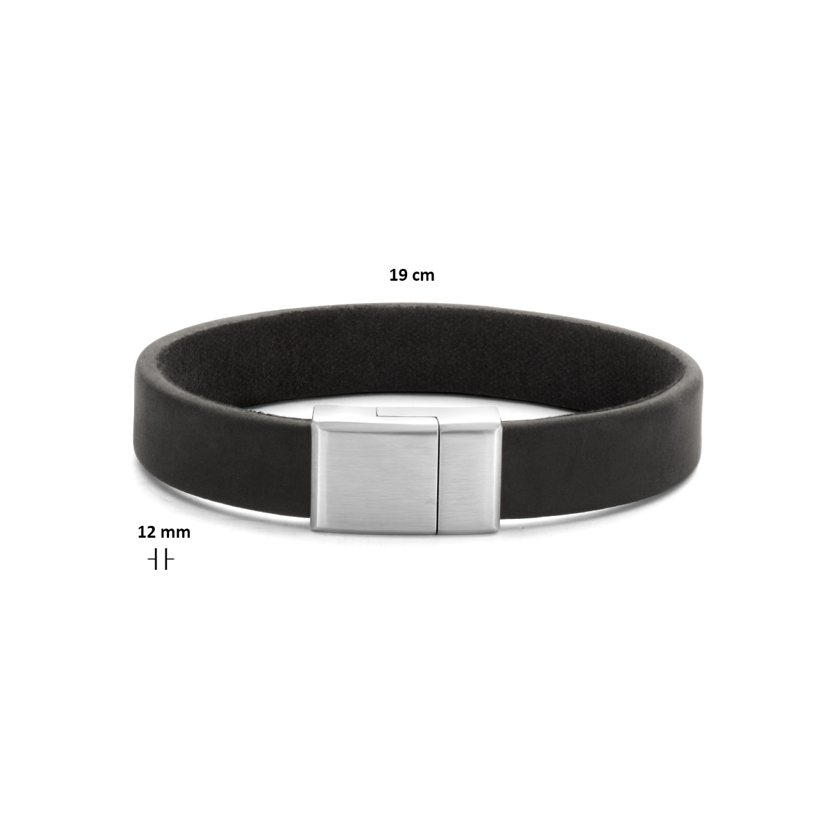 Zwart leren armband uitgevoerd met een stalen magneetsluiting. De armband heeft een breedte van 12mm.