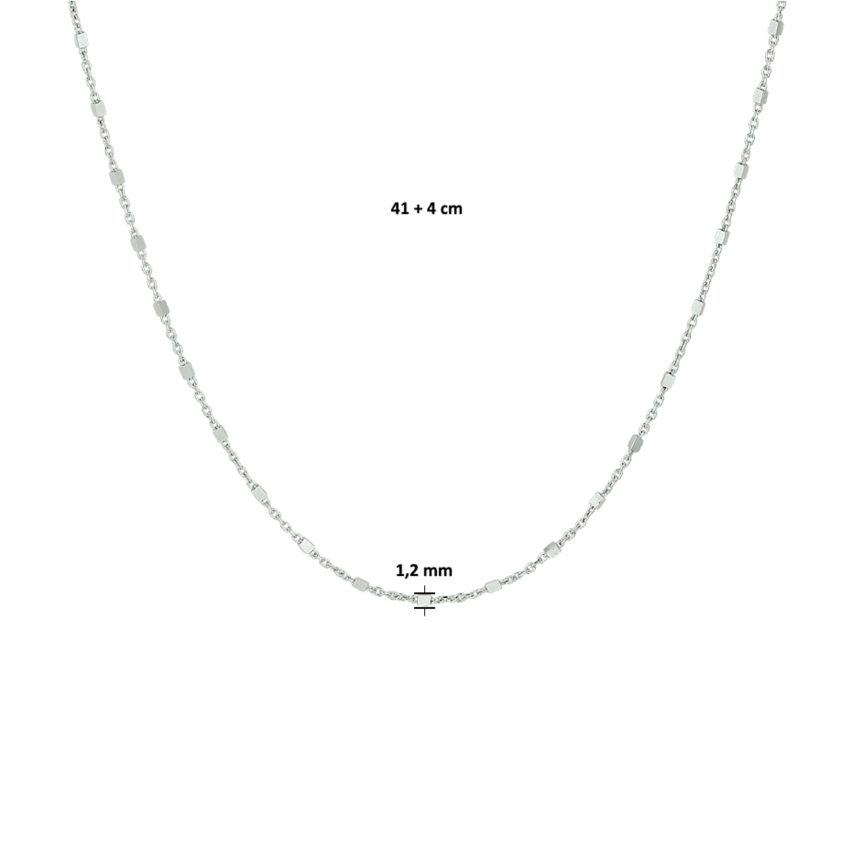 Gerhodineerd 925 zilveren 1.2mm blokjes collier uitgevoerd met een karabijn sluiting. Het collier heeft een draaglengte van 41cm met een extensie van 4cm.