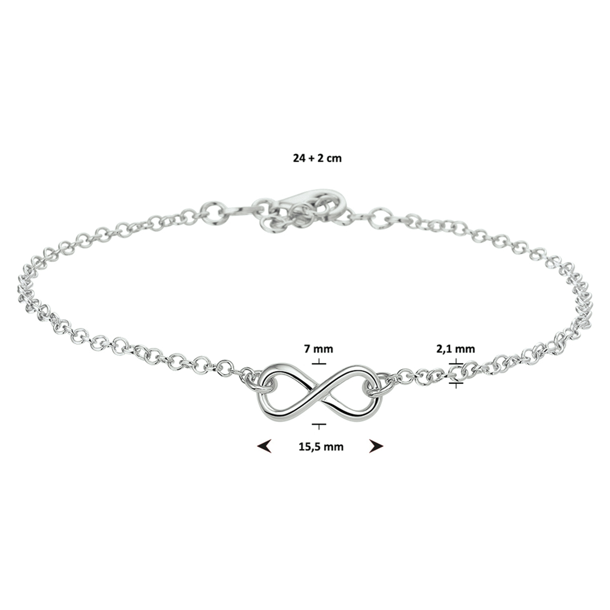 Beschrijving: Trendy gerhodineerd zilveren enkelbandje met een infinity symbool uitgevoerd met een stevige karabijn sluiting. Infinity symboliseert de eeuwige gebondenheid. Dit fijne enkelbandje is goed te combineren met bijpassende sieraden uit onze collectie. De lengte bedraagt 24cm met een extensie van 2cm en de schakelbreedte is 2.1mm.