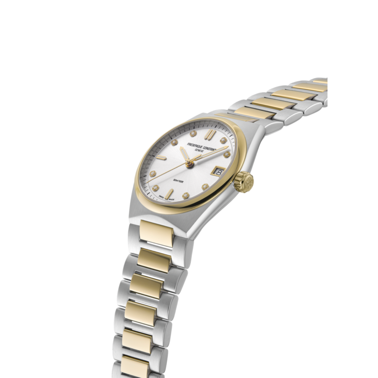 Dit dameshorloge is van het merk FREDERIQUE CONSTANT. Het horloge heeft een band gemaakt van edelstaal. De diameter van de kast is 31 mm en de kast is 7.29 mm dik.