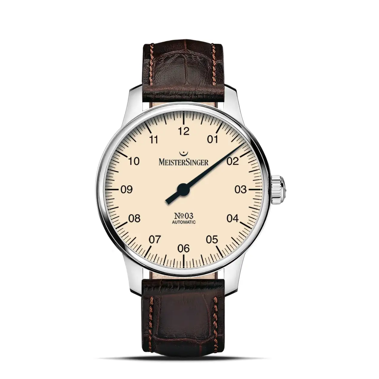 De №03 onderscheidt zich hoofdzakelijk door de automatische aandrijving van de MeisterSinger №01. Dit horloge wordt al heel lang als een icoon van de tijdmeting beschouwd en laat zien dat goede dingen nooit uit de mode raken. De №03 is vanwege het algehele vormgevingsconcept bekroond met de Good Design Award. Naast de krachtige 43 mm versie presenteert MeisterSinger de №03 in een vlakke 38 mm kast, zodat hij ook om een smallere pols gedragen kan worden.