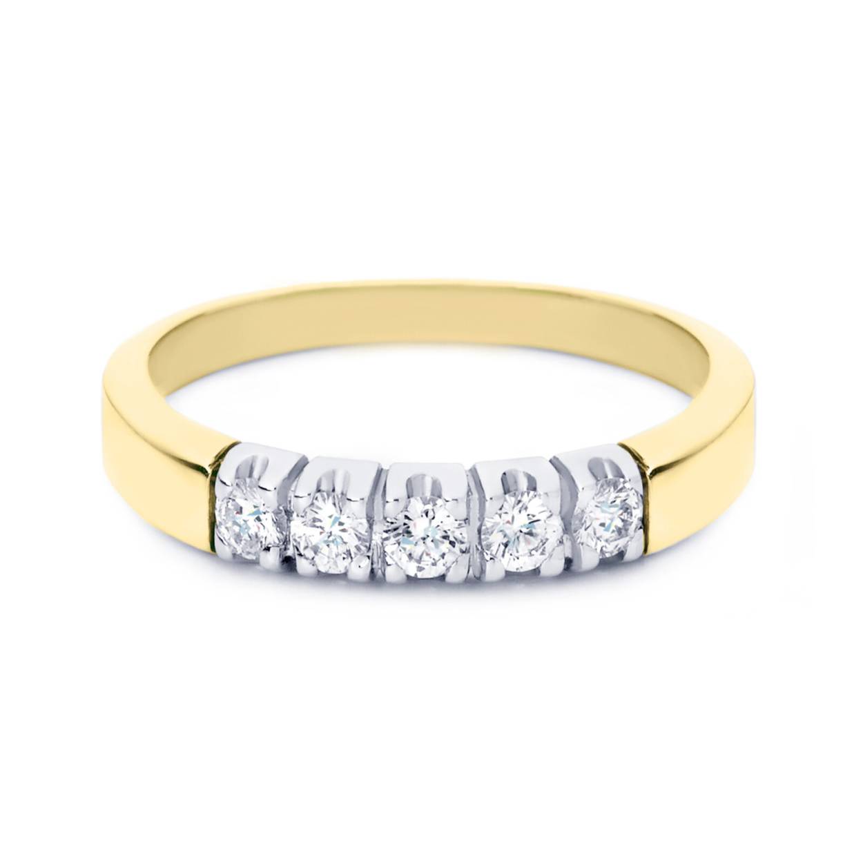 Op de afbeelding zien we een uitvoering met 5 briljant geslepen diamanten van 0.05ct per stuk in 14 karaat geelgoud.