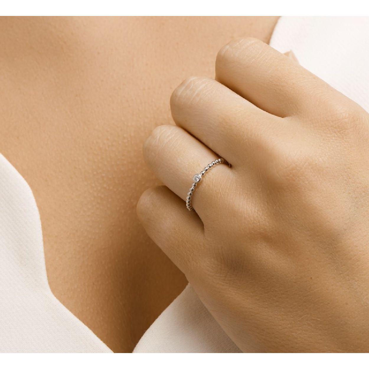 De ring is gemaakt van witgoud en is zilverkleurig. Het is een sieraad voor dames.