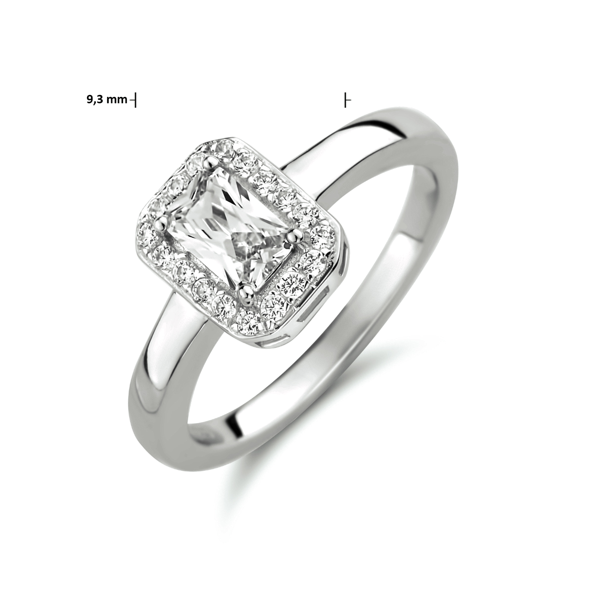 Gerhodineerd 925 zilveren ring uitgevoerd met schitterend zirkonia. De ring heeft een breedte van 9.3mm.