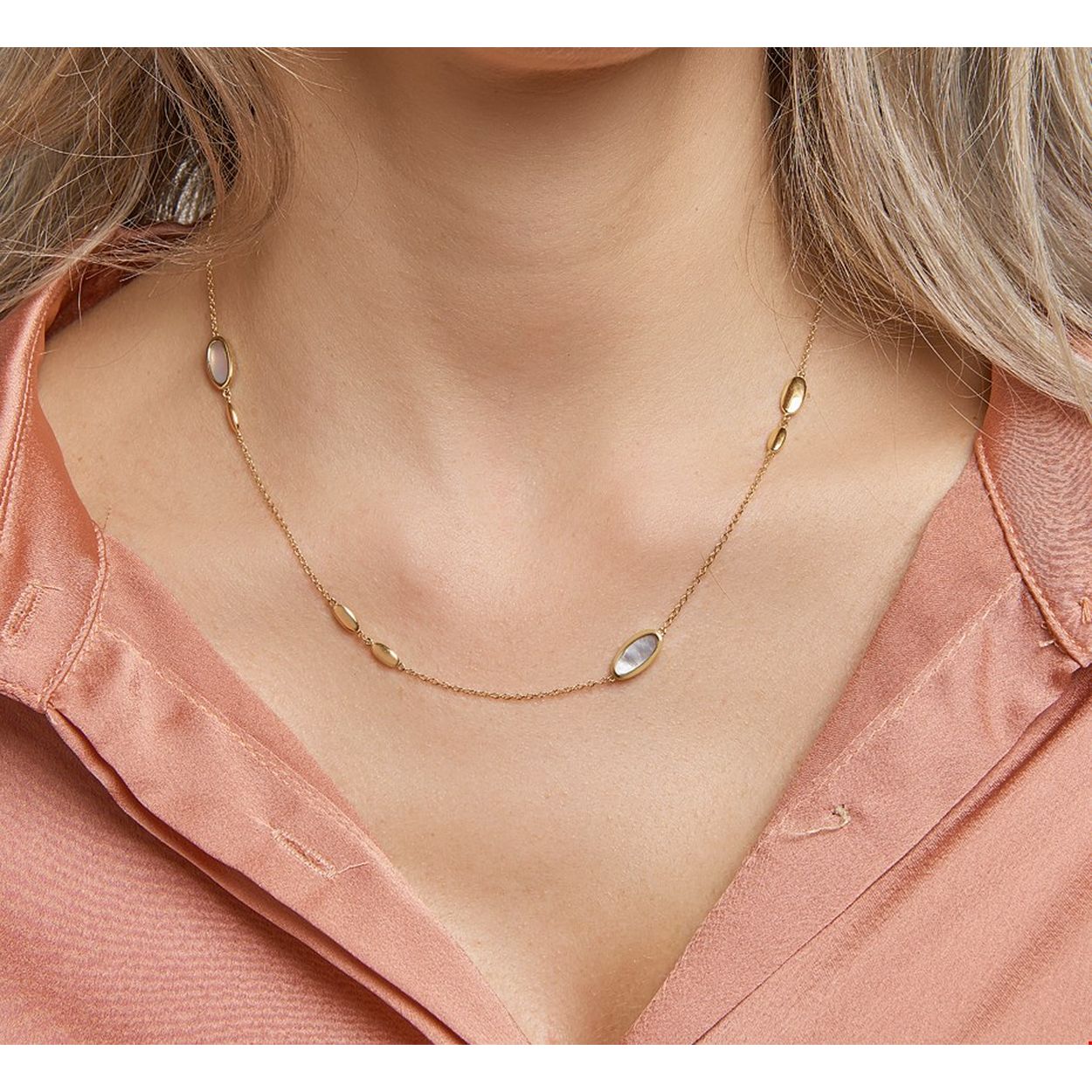 Beschrijving: 14k Geelgouden collier uitgevoerd met parelmoer, ovale elementen en een karabijn sluiting. Het collier heeft een draaglengte van 42cm en een extensie van 3cm.