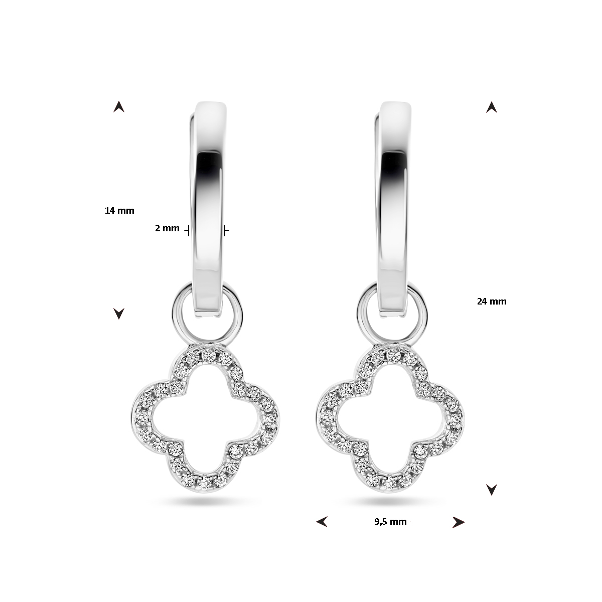 Gerhodineerd 925 zilveren oorringen in de vorm van een bloem uitgevoerd met zirkonia. De oorringen hebben een totale hoogte van 24mm.